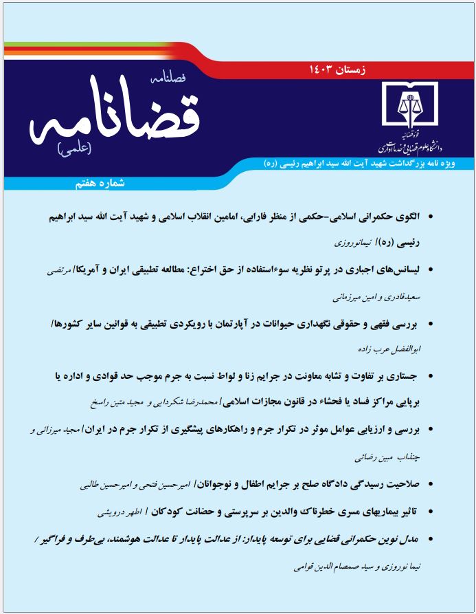فهرست مقالات دسترسی آزاد مقاله صفحه چکیده متن کامل 1 - الگوی حکمرانی اسلامی-حکمی از منظر فارابی، امامین انقلاب اسلامی و شهید آیت الله سید ابراهیم رئیسی (ره) نیما نوروزی دسترسی آزاد مقاله صفحه چکیده متن کامل 2 - لیسانسهای اجباری در پرتو نظریه سوءاستفاده از حق اختراع: مطالعه تطبیقی ایران و آمریکا مرتضی سعیدقادری امین میرزمانی دسترسی آزاد مقاله صفحه چکیده متن کامل 3 - بررسی فقهی و حقوقی نگهداری حیوانات در آپارتمان با رویکردی تطبیقی به قوانین سایر کشورها امیر مجتهدی دسترسی آزاد مقاله صفحه چکیده متن کامل 4 - جستاری بر تفاوت و تشابه معاونت در جرایم زنا و لواط نسبت به جرم موجب حد قوادی و اداره یا برپایی مراکز فساد یا فحشاء در قانون مجازات اسلامی محمدرضا شکردایی مجید متین راسخ دسترسی آزاد مقاله صفحه چکیده متن کامل 5 - بررسی و ارزیابی عوامل موثر در تکرار جرم و راهکارهای پیشگیری از تکرار جرم در ایران مجید میرزائی چنذاب مبین رضائی دسترسی آزاد مقاله صفحه چکیده متن کامل 6 - صلاحیت رسیدگی دادگاه صلح بر جرایم اطفال و نوجوانان امیرحسین فتحی امیرحسین طالبی دسترسی آزاد مقاله صفحه چکیده متن کامل 7 - تاثیر بیماریهای مسری خطرناک والدین بر سرپرستی و حضانت کودکان اطهر درویشی دسترسی آزاد مقاله صفحه چکیده متن کامل 8 - مدل نوین حکمرانی قضایی برای توسعه پایدار: از عدالت پایدار تا عدالت هوشمند، بیطرف و فراگیر نیما نوروزی سید صمصام الدین قوامی