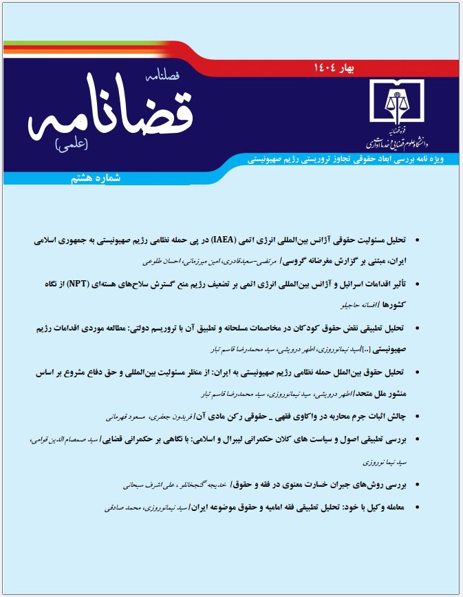 فهرست مقالات دسترسی آزاد مقاله صفحه چکیده متن کامل 1 - تحلیل مسئولیت حقوقی آژانس بینالمللی انرژی اتمی (IAEA) در پی حمله نظامی رژیم صهیونیستی به جمهوری اسلامی ایران، مبتنی بر گزارش مغرضانه گروسی مرتضی سعیدقادری امین میرزمانی احسان طلوعی دسترسی آزاد مقاله صفحه چکیده متن کامل 2 - تأثیر اقدامات اسرائیل و آژانس بینالمللی انرژی اتمی بر تضعیف رژیم منع گسترش سلاحهای هستهای (NPT) از نگاه کشورها افسانه حاجیلو دسترسی آزاد مقاله صفحه چکیده متن کامل 3 - تحلیل تطبیقی نقض حقوق کودکان در مخاصمات مسلحانه و تطبیق آن با تروریسم دولتی: مطالعه موردی اقدامات رژیم صهیونیستی با تأکید بر حملات اخیر به ایران در پرتو حقوق بینالملل بشردوستانه سید نیما نوروزی اطهر درویشی سید محمدرضا قاسم تبار دسترسی آزاد مقاله صفحه چکیده متن کامل 4 - تحلیل حقوق بینالملل حمله نظامی رژیم صهیونیستی به ایران: از منظر مسئولیت بینالمللی و حق دفاع مشروع بر اساس منشور ملل متحد اطهر درویشی سید نیما نوروزی سید محمدرضا قاسم تبار دسترسی آزاد مقاله صفحه چکیده متن کامل 5 - چالش اثبات جرم محاربه در واکاوی فقهی _ حقوقی رکن مادی آن فریدون جعفری مسعود قهرمانی دسترسی آزاد مقاله صفحه چکیده متن کامل 6 - بررسی تطبیقی اصول و سیاست های کلان حکمرانی لیبرال و اسلامی: با نگاهی بر حکمرانی قضایی(۲) سید صمصام الدین قوامی سید نیما نوروزی دسترسی آزاد مقاله صفحه چکیده متن کامل 7 - بررسی روشهای جبران خسارت معنوی در فقه و حقوق خدیجه گنجخانلو علی اشرف سبحانی دسترسی آزاد مقاله صفحه چکیده متن کامل 8 - معامله وکیل با خود: تحلیل تطبیقی فقه امامیه و حقوق موضوعه ایران سید نیما نوروزی محمد صادقی